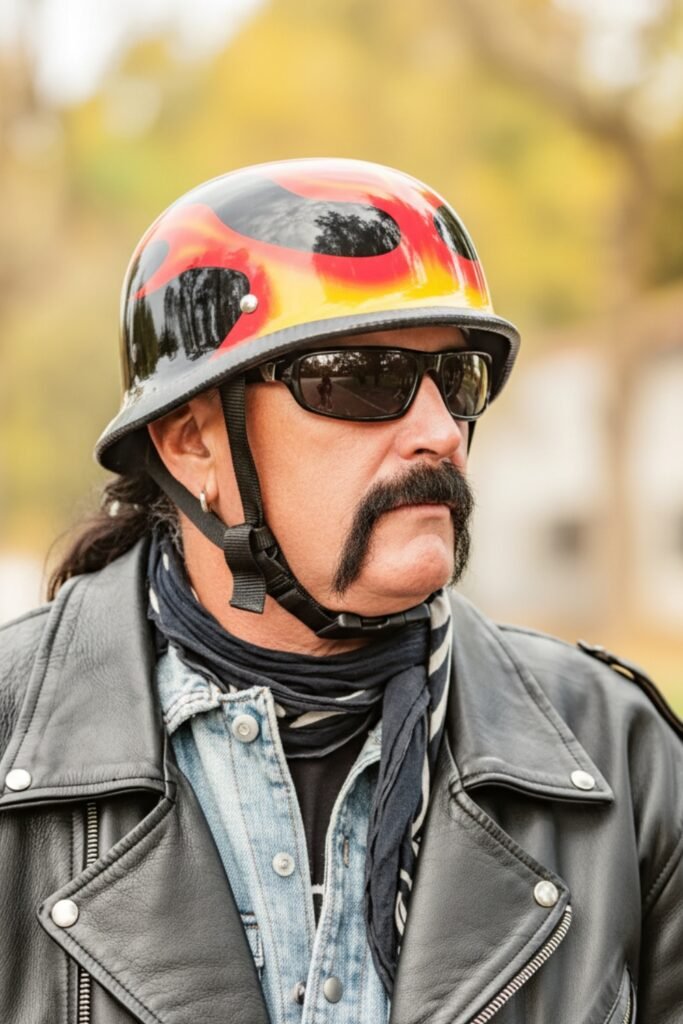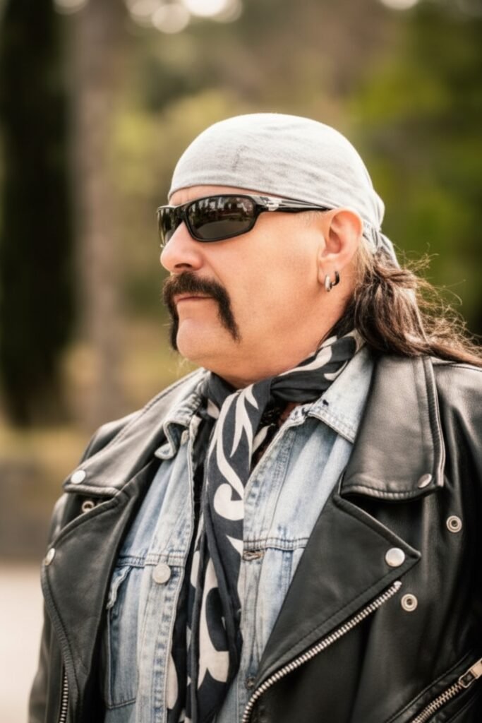 The biker horseshoe mustache gives you a tough masculine expression with a solid, iconic facial hair shape. You maintain it by trimming the center evenly and letting the sides drop sharply toward the jaw.