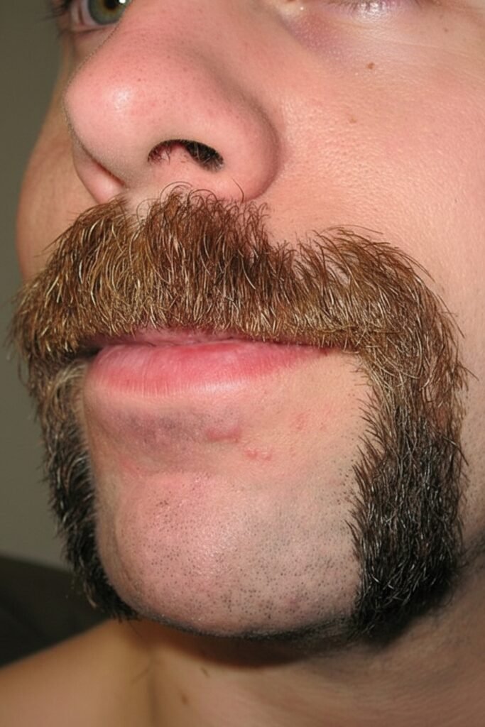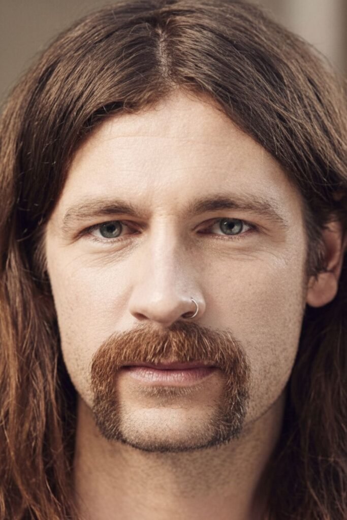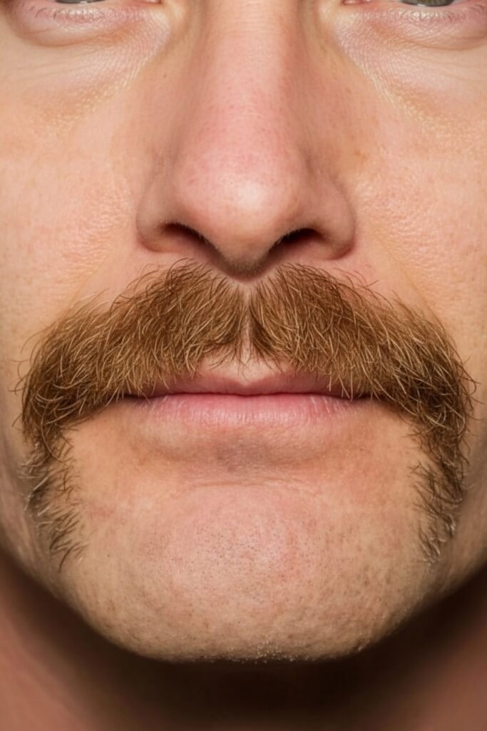 A Long Horseshoe Mustache gives you a more dramatic and rugged look that feels inspired by vintage grooming and Western mustache culture. Trim the top regularly while allowing the lower ends to grow longer, shaping them with scissors for balance.