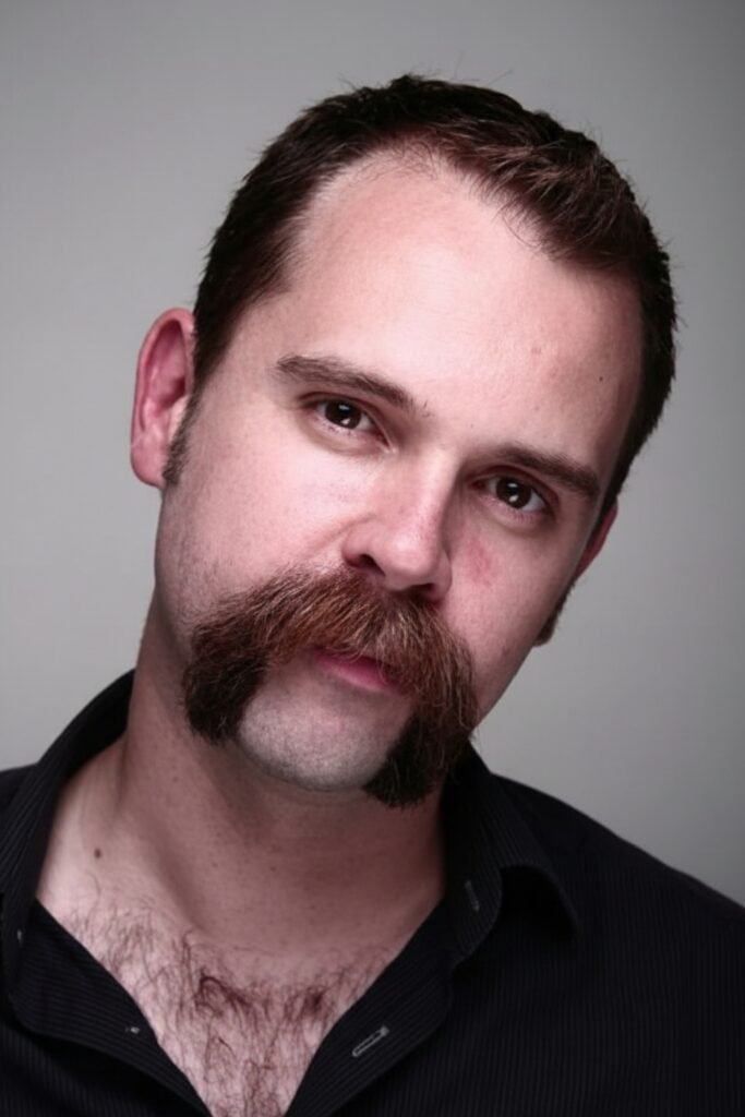 Apply mustache wax to gently control the curve and add shine. This facial hair style suits men who enjoy vintage grooming and expressive looks.