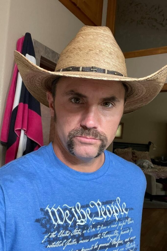 Apply mustache wax for stiffness and control throughout the day. This masculine style suits men who enjoy vintage grooming and bold facial hair styles. It looks great for casual outdoor events. Match it with long wavy hair for a truly Western-inspired appearance.