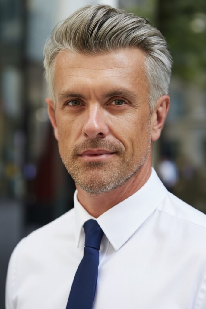 A classic grooming cream provides hold and shine without stiffness. This hairstyle suits formal settings and professional environments, projecting confidence, maturity, and refined personal style.