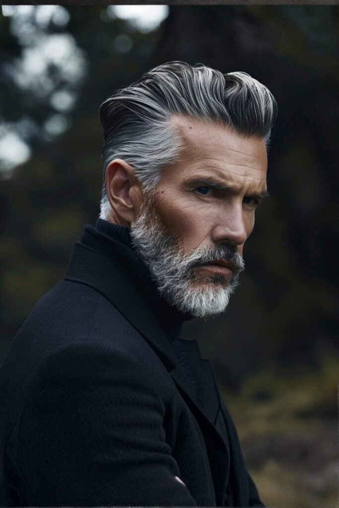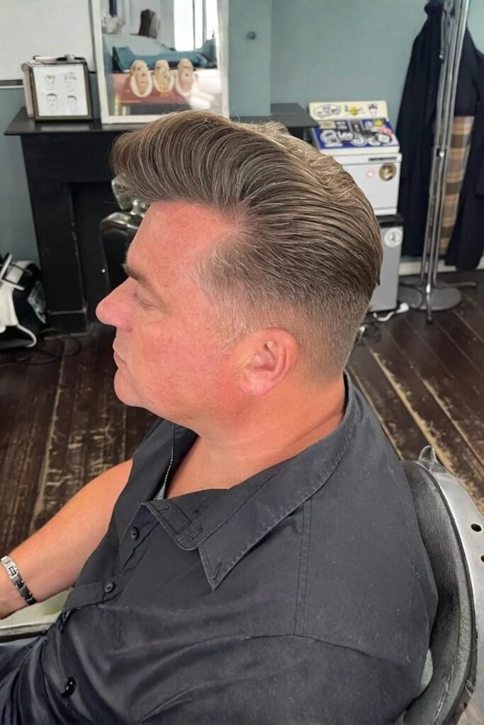 A volumizing mousse lifts the roots and supports the shape. This style works well for special occasions or evenings out. It feels bold, intentional, and well-suited for confident, mature men.
