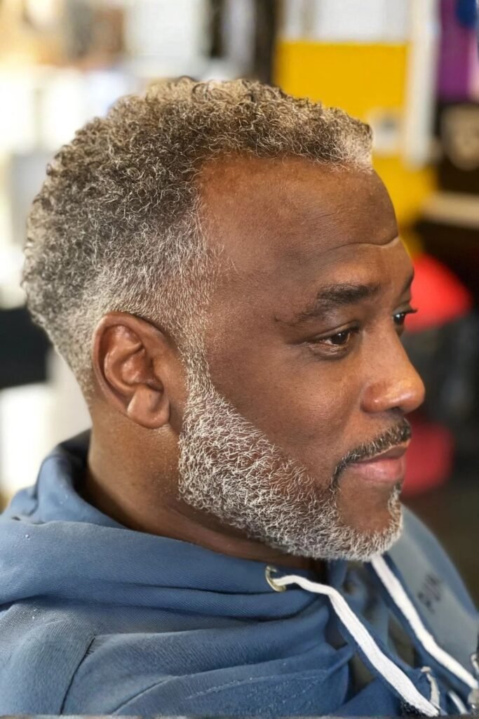 A short afro paired with a beard creates a strong, grounded look. Natural texture adds character, while the fade keeps the sides sharp and tidy.