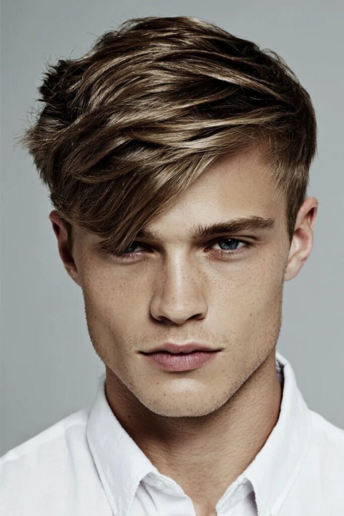 The side swept haircut offers a clean yet casual men’s hair look with strong grooming appeal. The top is left medium length with soft layers, while the sides stay neat. Apply hair clay from mid lengths to ends, guiding the hair sideways with your fingers.