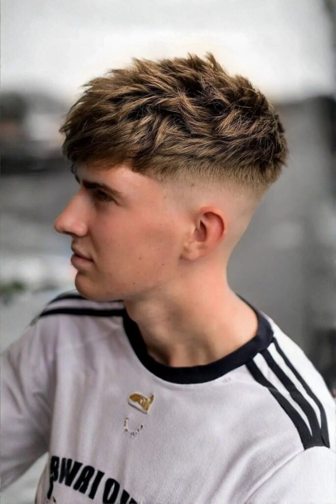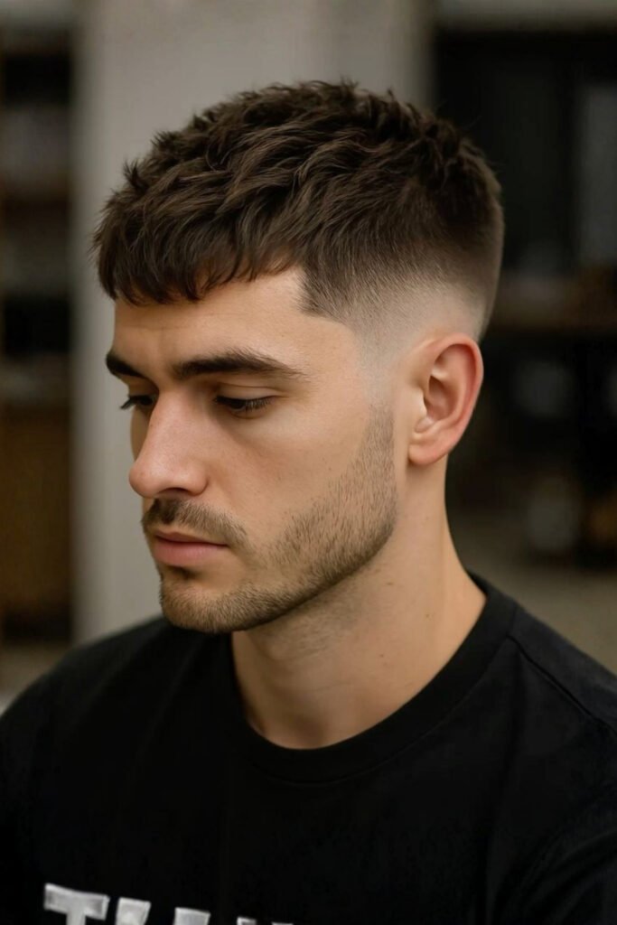 This modern men’s haircut keeps the sides tight with a fade and leaves the top short but heavily textured. Hair clay is ideal here because it adds grip without weight. You apply a small amount and pinch the hair to build definition and movement.