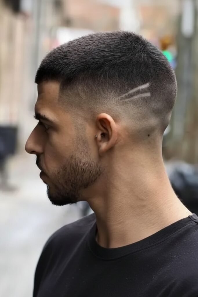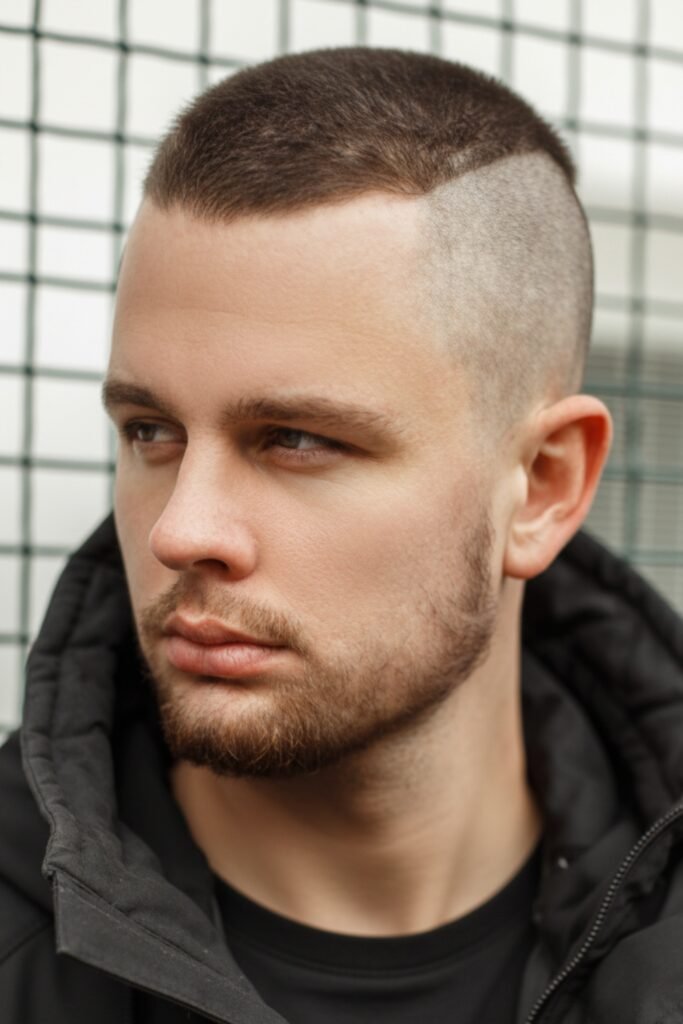 The buzz cut with a beard combines simplicity with rugged masculinity. The short, clean cut on the scalp contrasts with the fuller, shaped beard, creating a strong, balanced look.