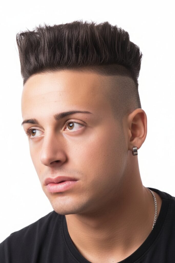A high fade mohawk offers a bold, ultra-modern look. The sharply faded sides highlight the height and texture of the mohawk.