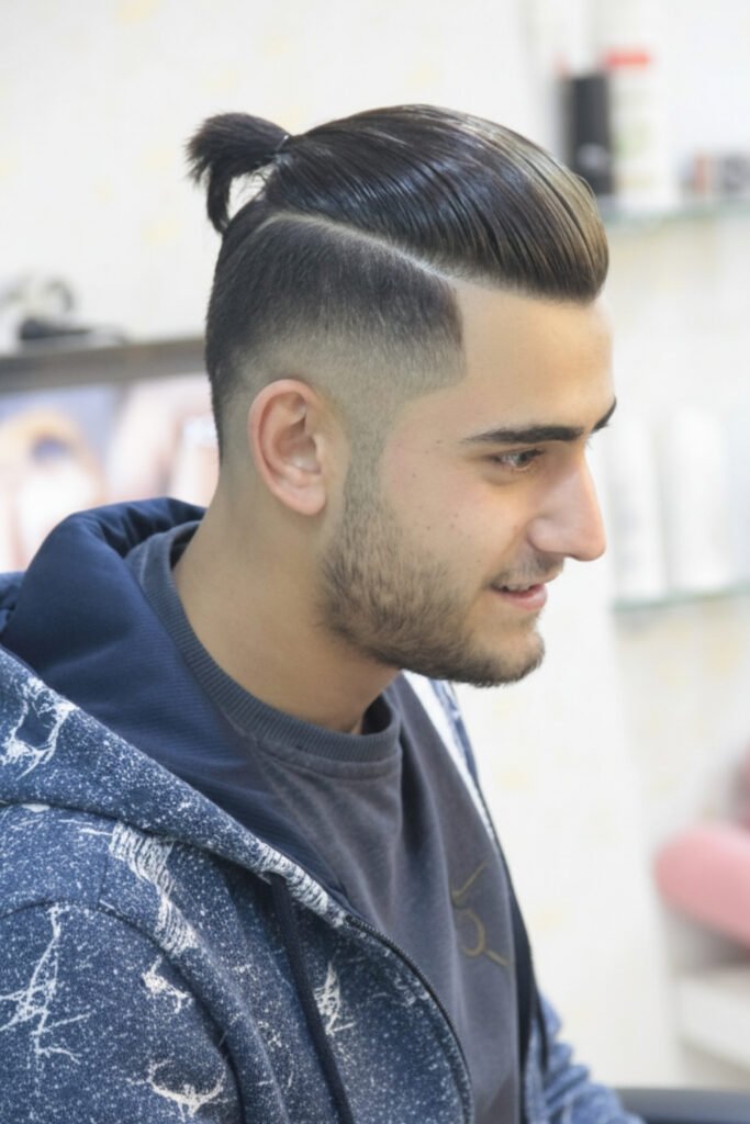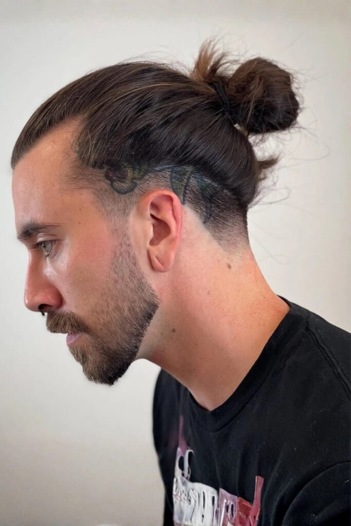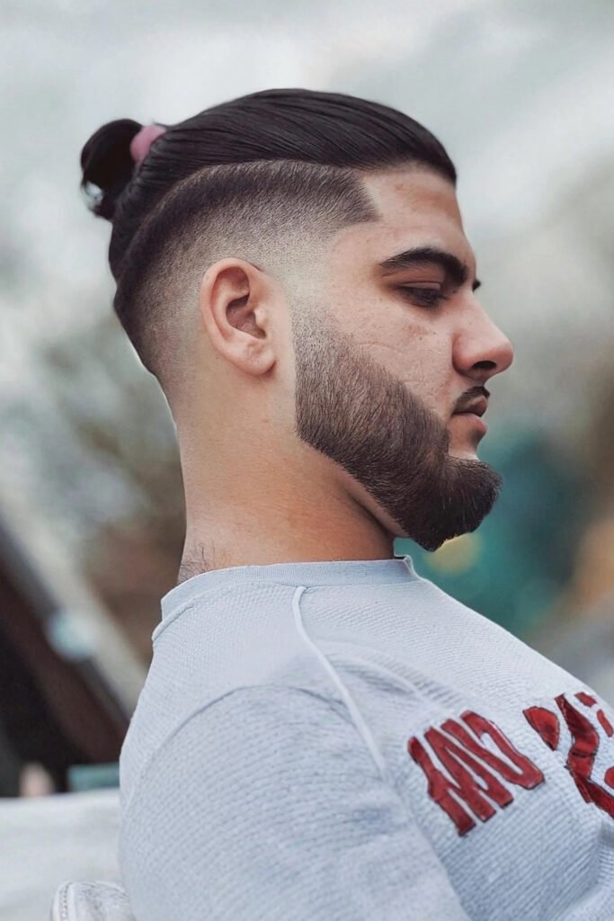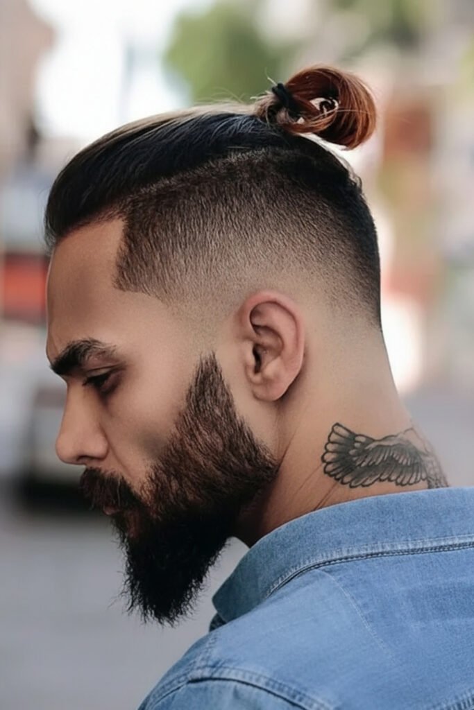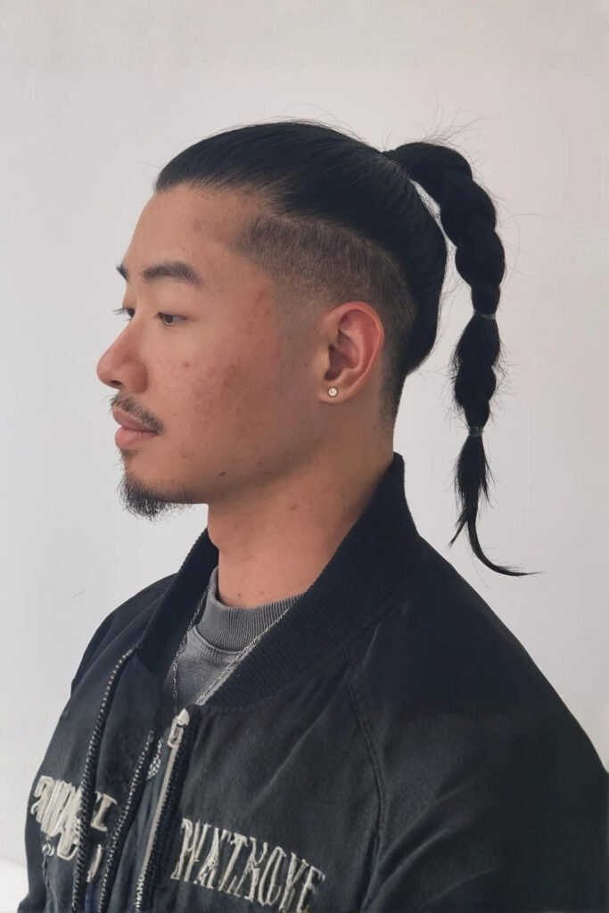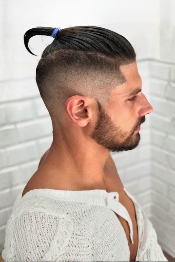 Ask for shaved or faded sides with longer hair on top that can be pulled into a high ponytail. Specify the fade type—skin, mid, or taper—for a clean look.
