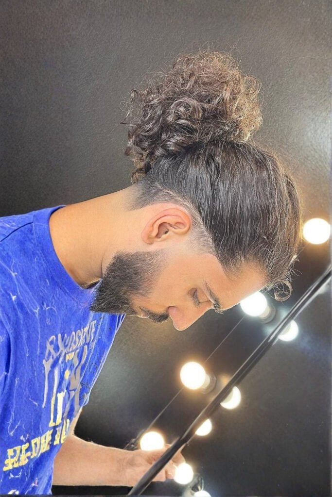 This style blends bold men’s hairstyle confidence with modern samurai hair inspiration, perfect for guys with square or oval faces and wavy hair. Style with matte clay and sea-salt spray. Pair with a Van Dyke beard for contrast.