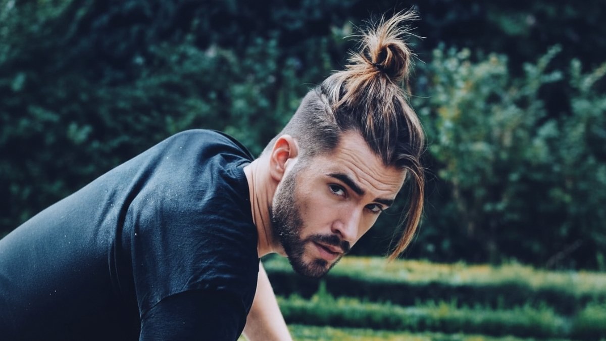 This style blends modern samurai hair heritage with West-Coast wellness, ideal for men with oval faces and straight hair. Style with matte clay and a diffuser for shine without frizz.