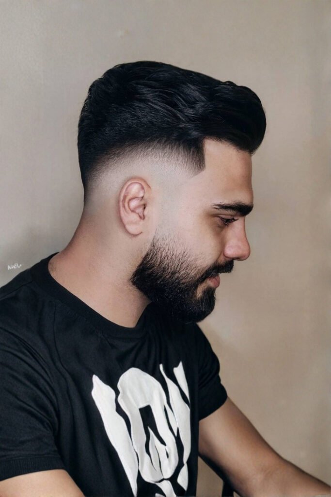 This style is clean, fresh, and perfect for modern men. The fade begins at the temples using a #0 or #1 guard and tapers into a disconnected undercut with 2–3 inches left on top for texture. Great for thick hair and round or square face shapes.