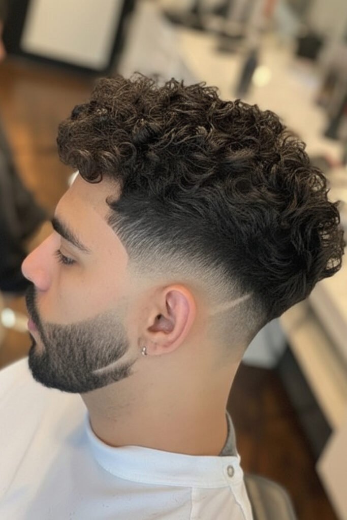 Ideal for men with wavy or curly hair and round or heart-shaped faces. A skin-faded beard or trimmed goatee completes the look. Use curl-defining cream or texturizing powder to shape the top. Rock it with hoodies, cargo pants, or gym fits.