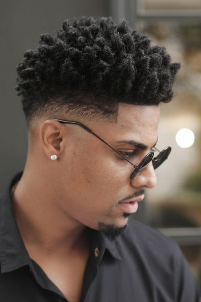 Bold, cultural, and high on texture, this undercut taper fade for black male styles fades from a #0 to #1 into a clean undercut, keeping 3–4 inches of twisted curls or coils up top. Great for round and oval face shapes with naturally curly or kinky hair.