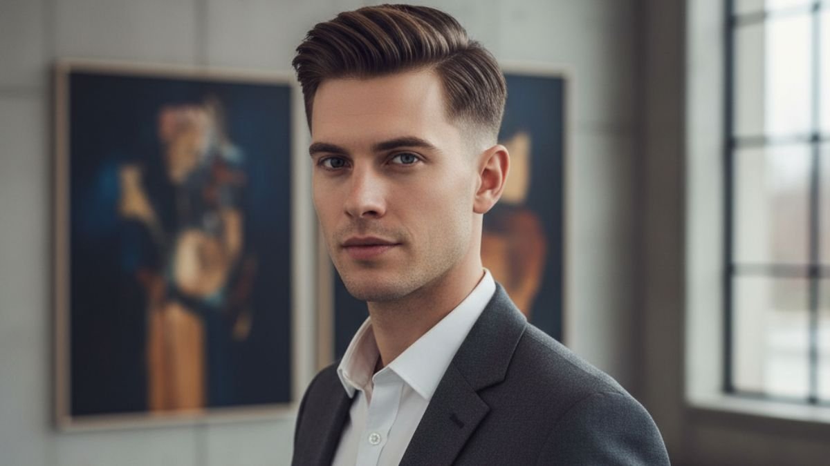 A light styling gel helps maintain the clean lines. This look offers a polished yet edgy appearance, making it suitable for both formal occasions and casual outings, balancing sophistication and style.