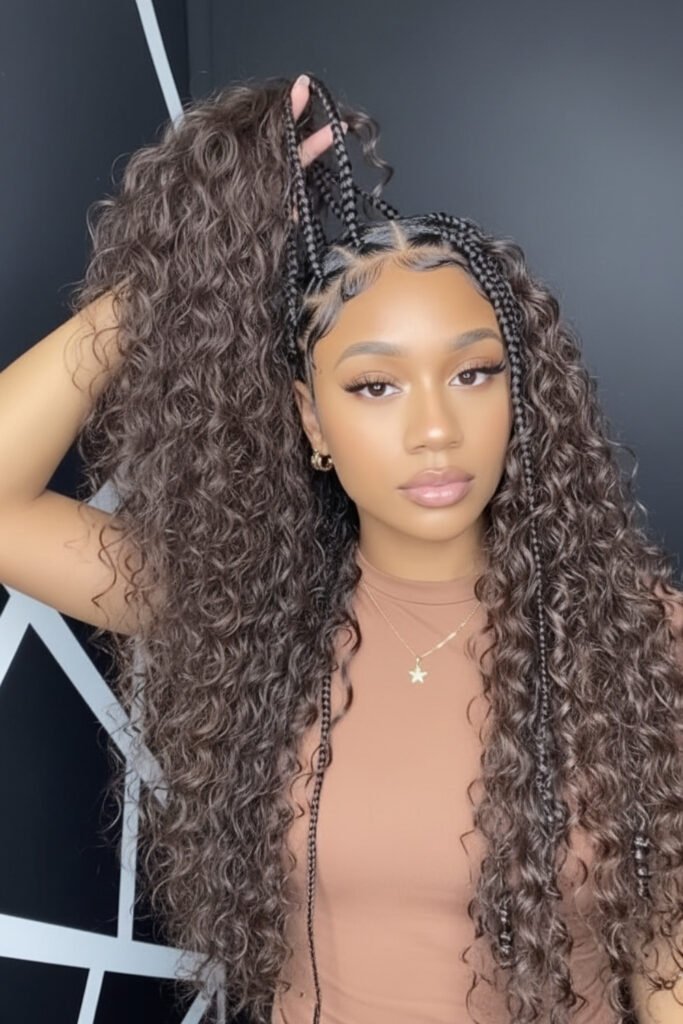 Curly leave out with knotless braids mixes texture and glam. Keep your curls shiny and edges clean. Wear with a tube top, baggy jeans, and sneakers. Add brown lip liner and clear gloss. Perfect for weekend shopping, casual dates, and Instagram photos.