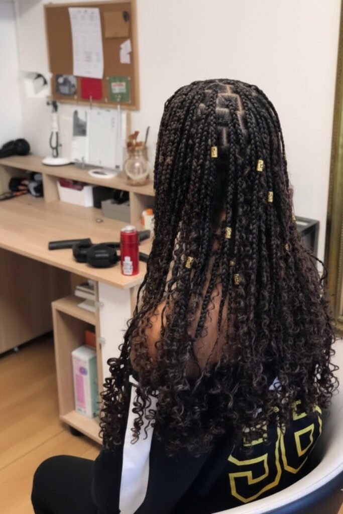 Boho knotless braids mix sleek braids with loose curls, giving flirty feminine baddie hairstyle vibes. Choose honey blonde highlights and springy baddie braids with curls at the ends. Style baby hairs soft and swooped.