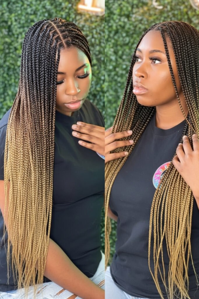Ombre knotless braids shift from black to caramel or blonde for fashion-forward energy. Sleek baby hairs complete the feminine vibe. Wear a cropped varsity jacket, leggings, and hoops.
