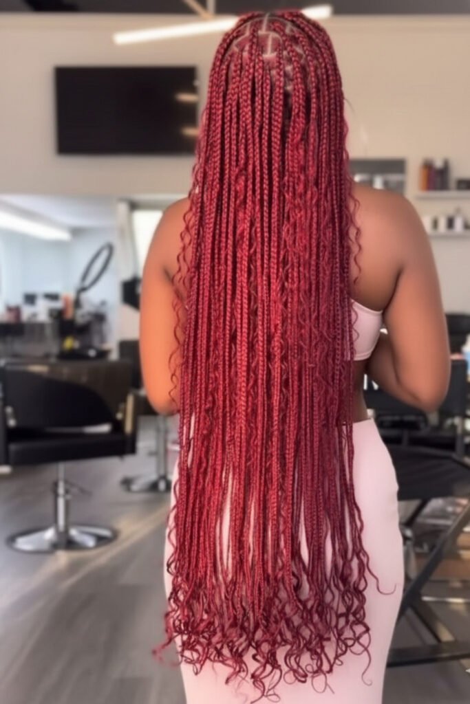 Red braids add fearless bold hair look energy that screams confidence. Choose long knotless braids in deep red with polished edges. Style with leather jacket, bodycon dress, and gold hoops.