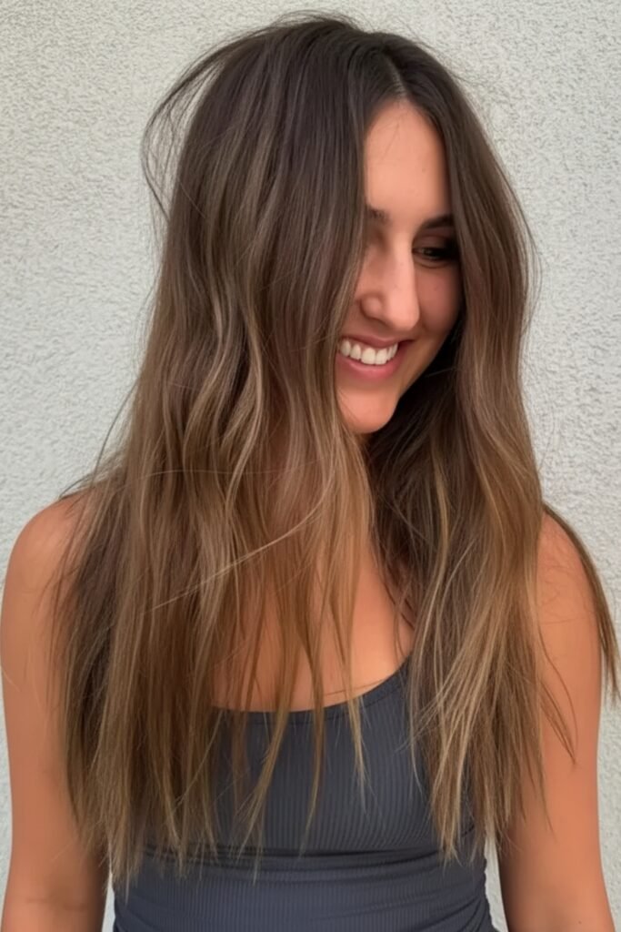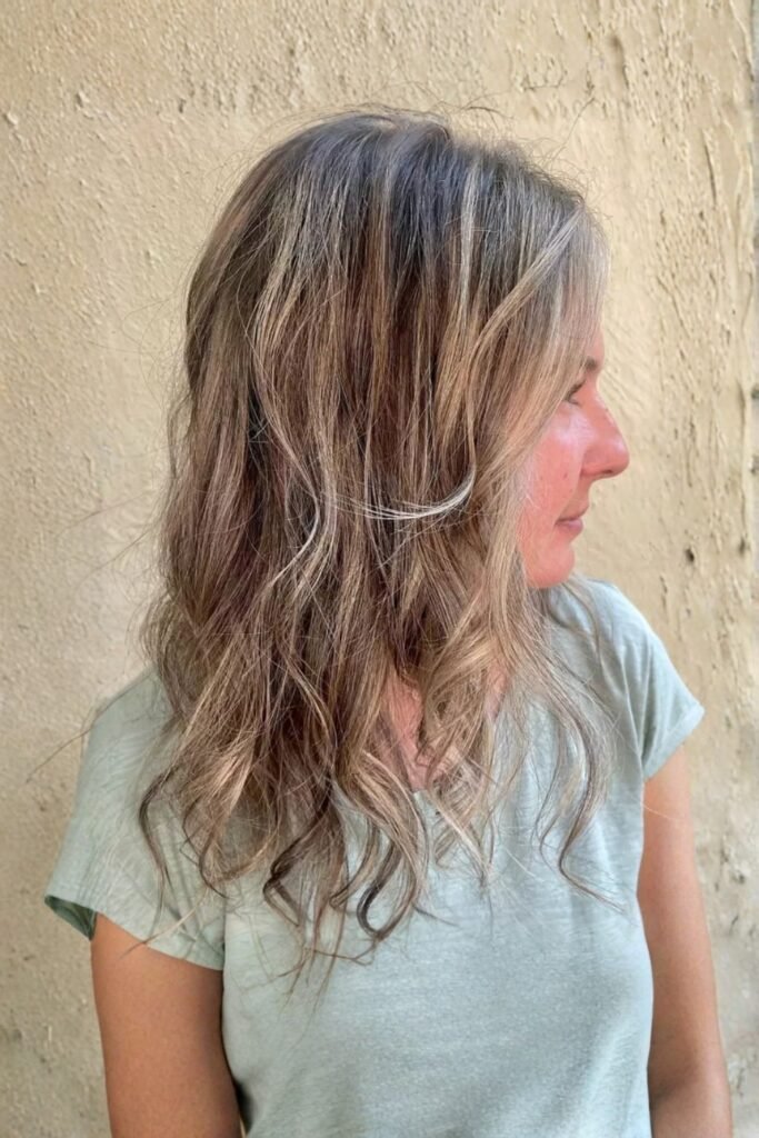 Ashy brunette with textured layers offers a cool, modern look. The muted brunette base is paired with soft layers, enhancing the texture and movement.
