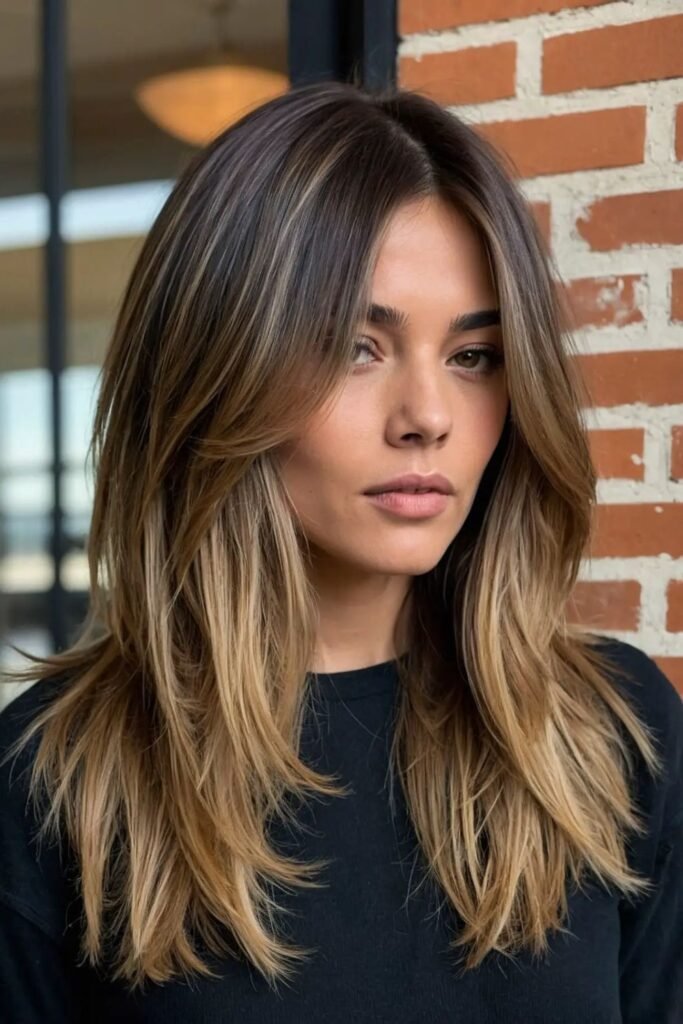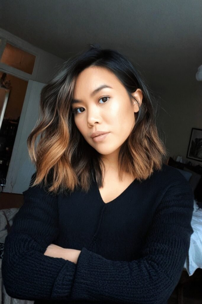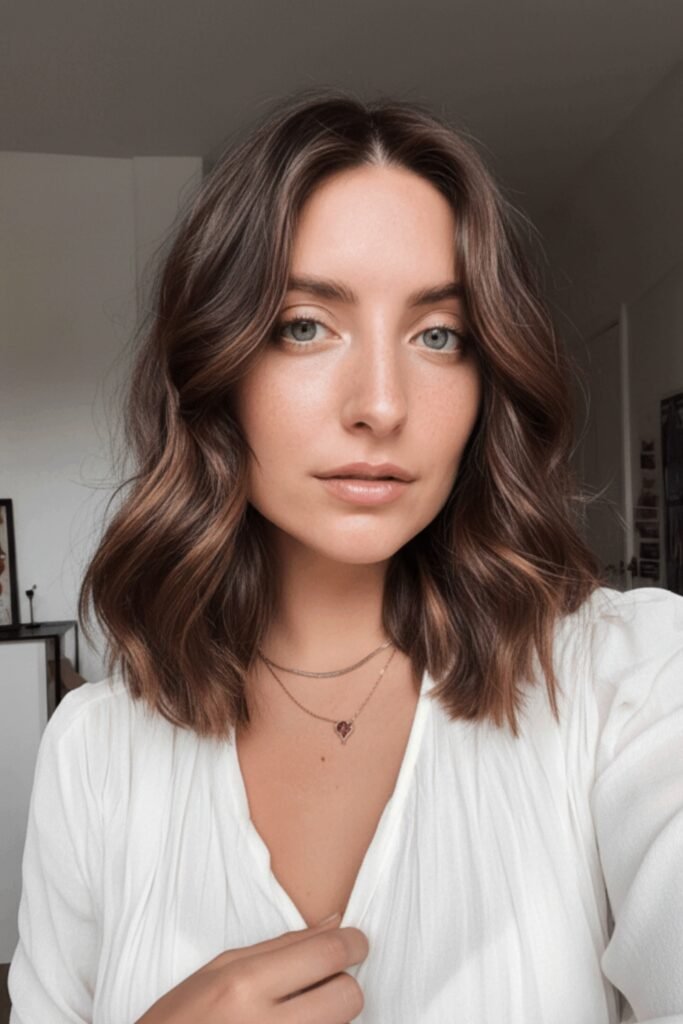 Mid-length brunette hair with golden balayage creates a warm, sun-kissed glow. The hand-painted highlights blend beautifully with the natural brown base, adding dimension.
