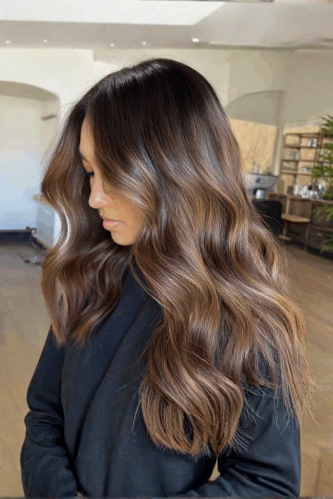 Chocolate swirl glam brings depth to brunette hair, combining rich chocolate tones with soft, dimensional highlights. The swirling effect adds interest and movement.