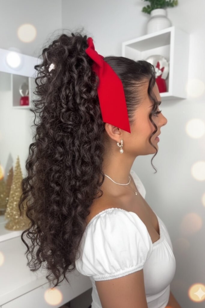 A puff with a festive bow is the easiest Christmas hairstyle because you can style it quickly, keep curls soft, and add cute accessories for instant holiday charm.