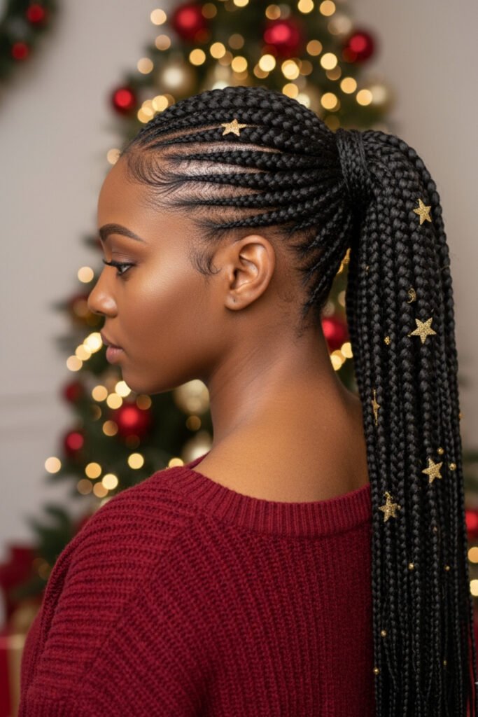 This feed in ponytail creates a sleek Christmas hairstyle that blends protective styling with festive sparkle. Gold star clips shine throughout the braid, giving the look magical holiday charm.