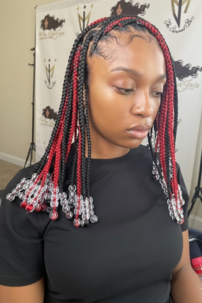These knotless braids create a protective style that lasts through the whole season while giving you a cheerful Christmas hairstyle. The ends are decorated with red and gold Christmas beads that shine during holiday photoshoots.