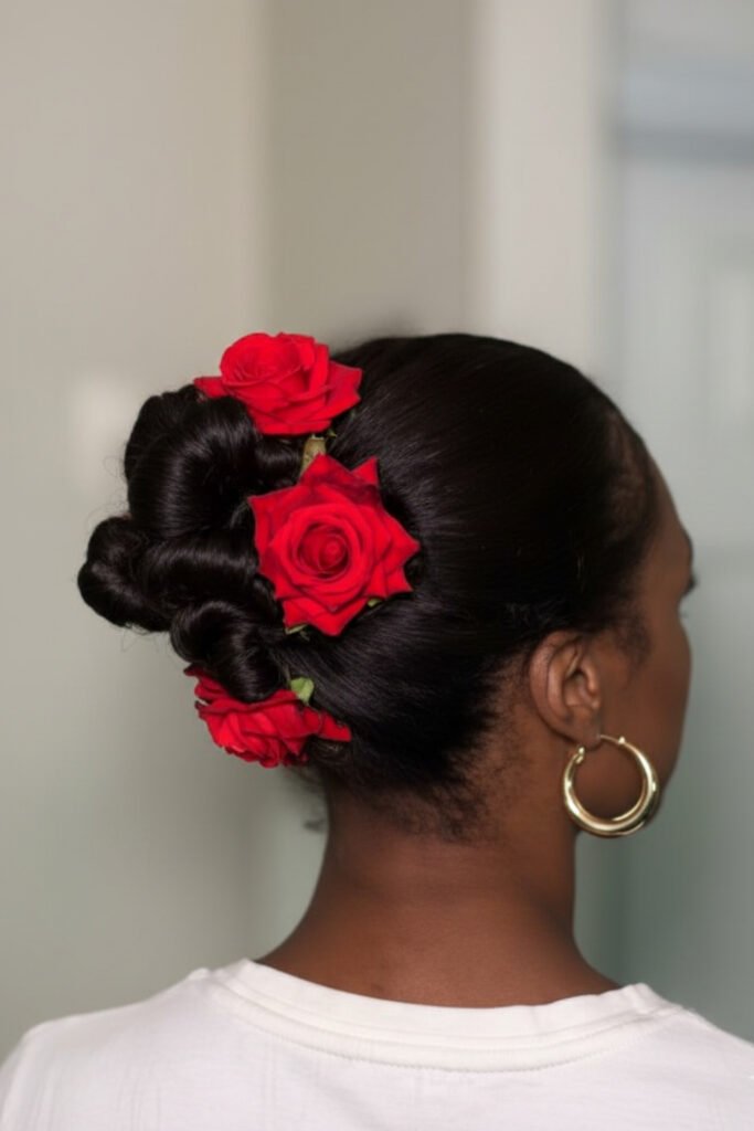 This low braided bun is a sweet Christmas hairstyle that feels timeless and elegant. Red floral clips add gentle holiday color while keeping the style soft enough for natural hair. A bit of moisturizing gel helps create a smooth finish.