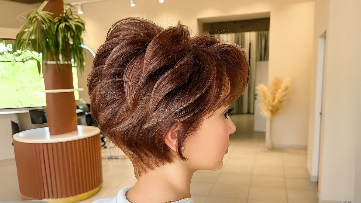 Tousled pixie layers in deep brown create casual volume and effortless texture. Pair with peach lipstick and rose gold eyeshadow for soft warmth.