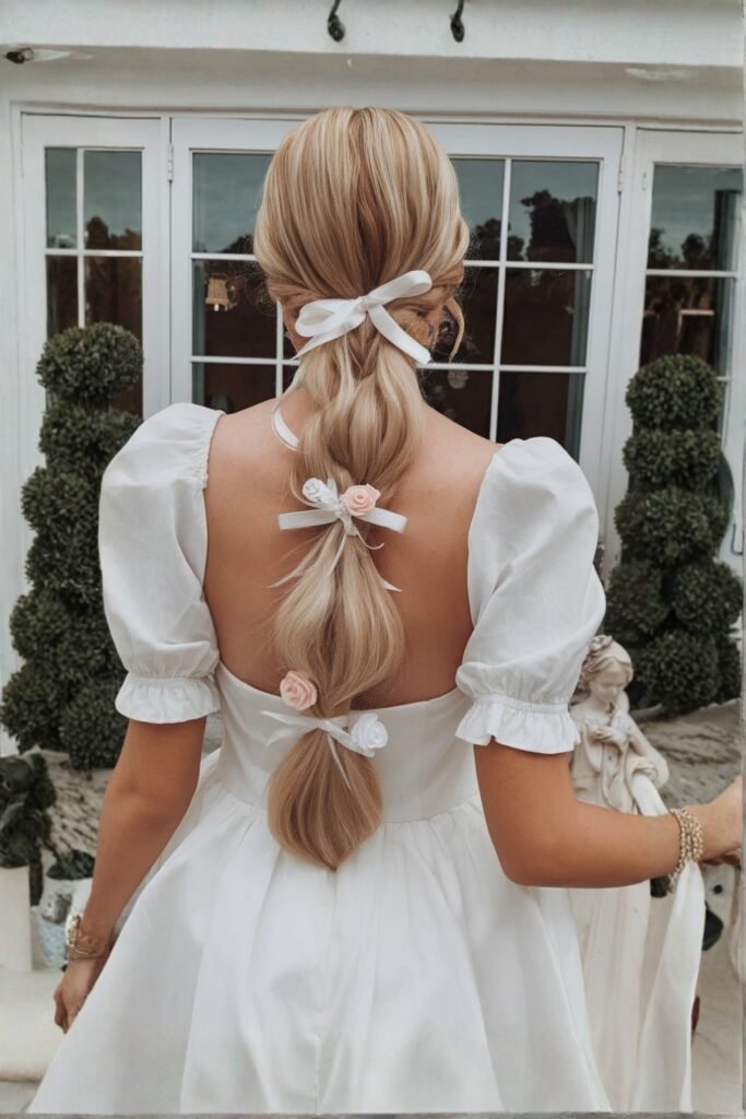 The romantic braided ponytail with ribbons combines elegance with charm. Braids are loosely done, allowing for softness, while the ribbons add a playful, whimsical touch.
