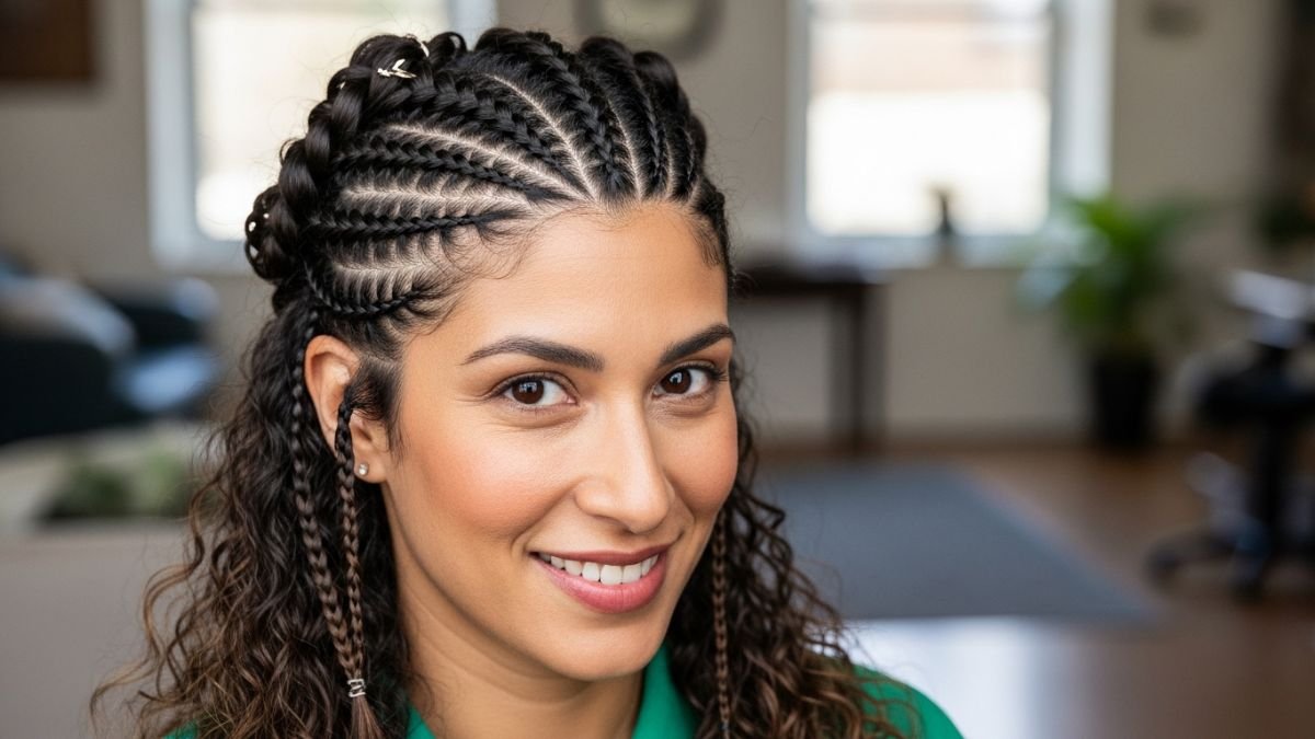 Want something bold, fun, and youthful? Criss-cross braids with beads are a statement look that blends intricate cornrows and stylish parting techniques.