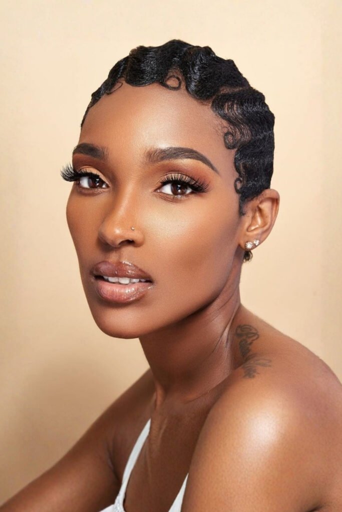 Finger waves create a glamorous short hairstyle for Black women that feels timeless and feminine. The sculpted waves give a polished soft glam finish and bring attention to your cheekbones.