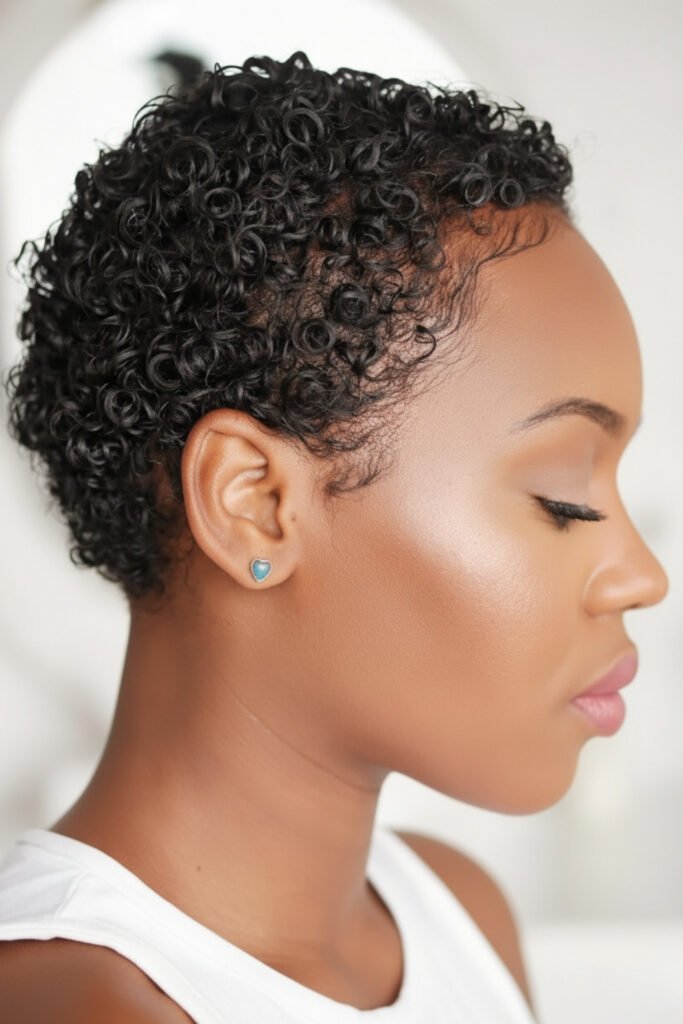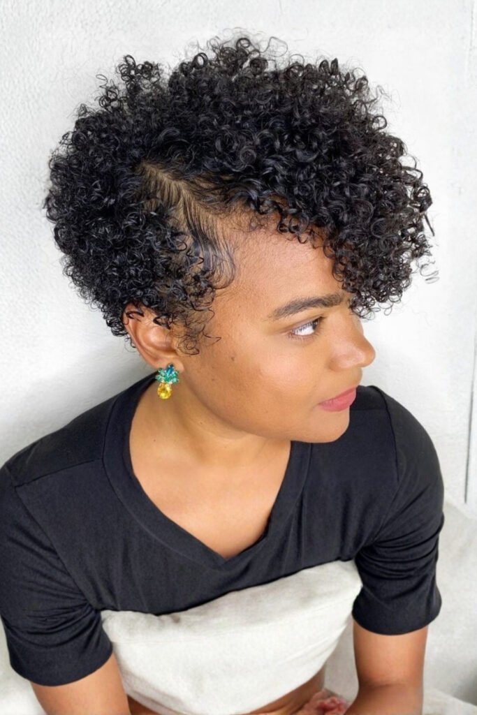 A curly pixie cut for Black women brings playful movement and feminine beauty with defined curls that frame your face beautifully. This style keeps length at the top while staying cropped on the sides for a soft yet bold hair look.