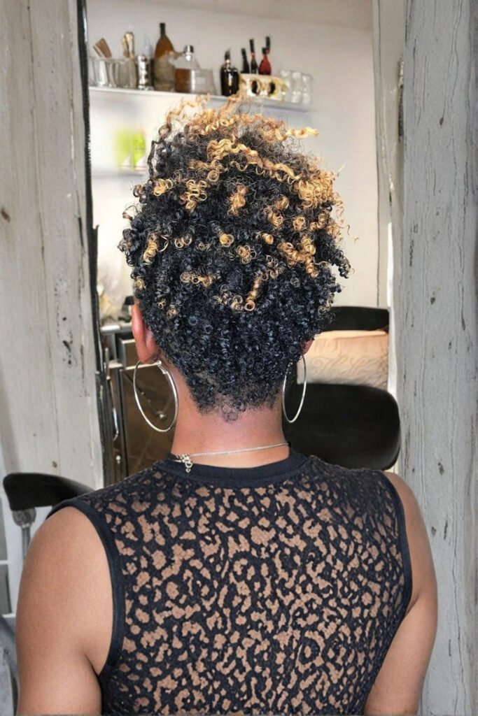 A short Afro with warm highlights adds brightness and beautiful warmth to natural coils. This short hairstyle for Black women feels fun, soft, and summery. Wear printed dresses, hoop earrings, and cute sandals.