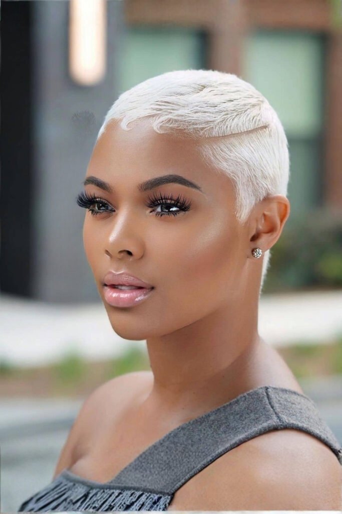 A platinum blonde buzz cut style creates fierce feminine power with a clean silhouette and bright color pop. This short hairstyle for Black women highlights your eyes and cheekbones. Pair with statement earrings, bold liner, and nude gloss.