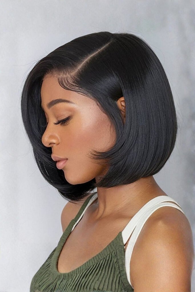 A short silk-pressed bob gives sleek elegance with a smooth finish and soft ends that curl under gently. This short hairstyle for Black women brings classic feminine beauty and modern grace.