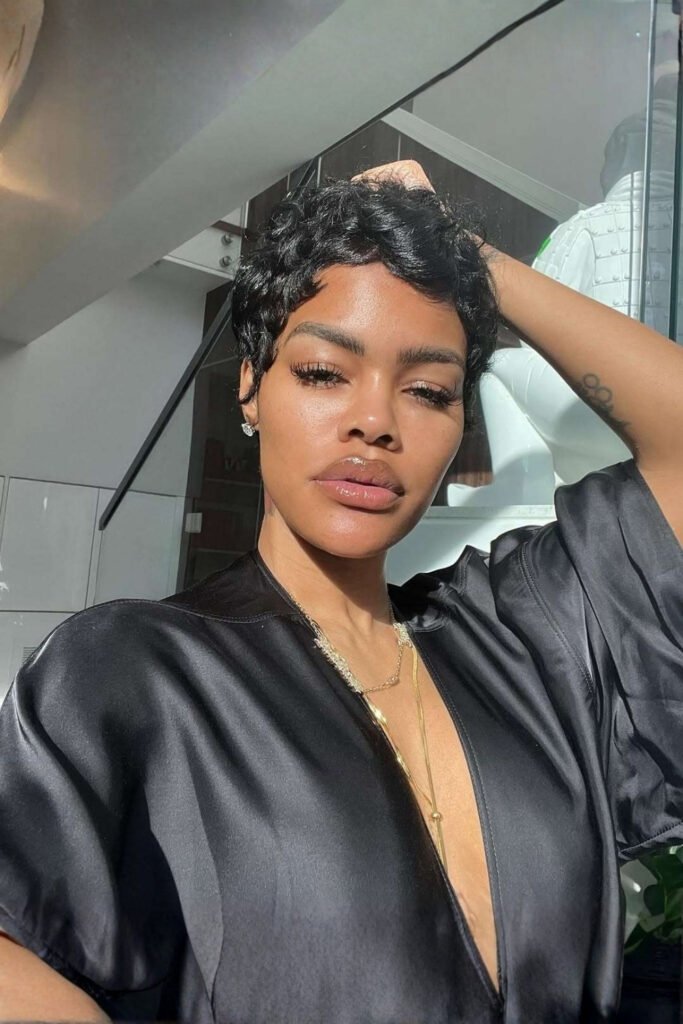 This short hairstyle for Black women creates a fresh, bold hair look that pairs beautifully with gold studs, a fitted graphic tee, and leather pants. Go for luminous skin, sharp brows, and clear gloss for a clean soft glam effect.
