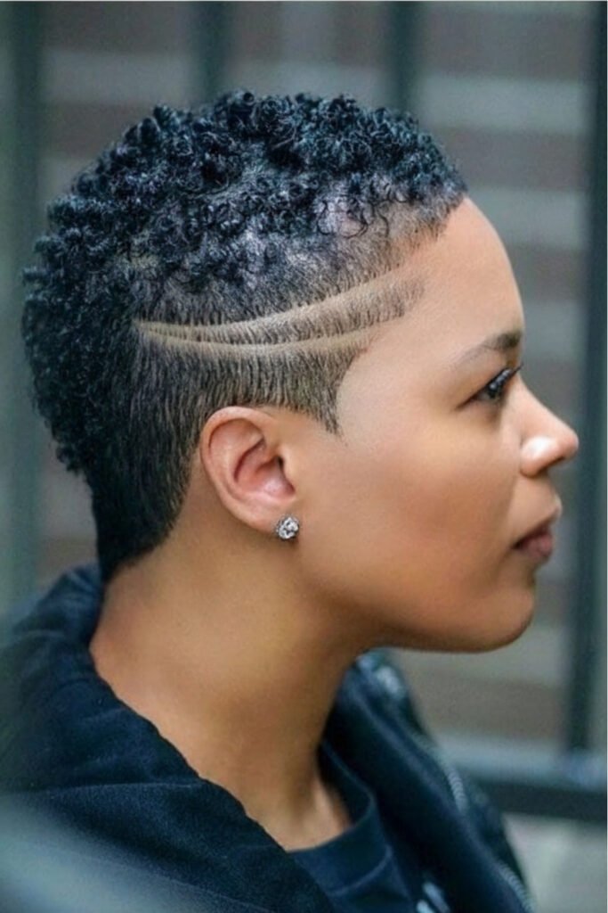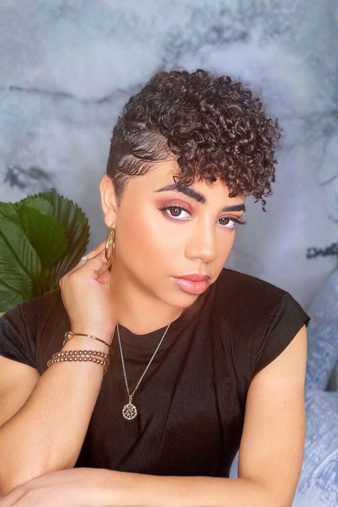 A tapered cut with shaved sides creates a bold and stylish textured short hair look that keeps curls voluminous on top. This short hairstyle for Black women pairs beautifully with large hoops, a fitted crop jacket, and straight-leg jeans.