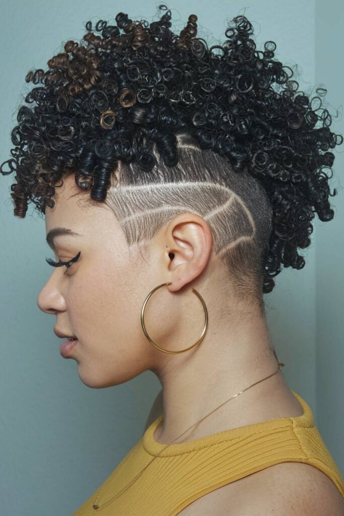 A curly frohawk gives bold texture and feminine beauty with shaped coils rising along the center. The sleek sides add structure and balance. Style it with a fitted jacket, wide-leg pants, and statement hoops.