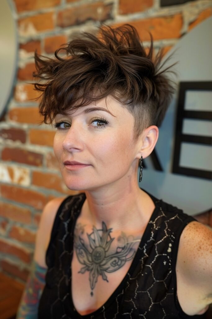 Team with patterned shirts and shorts for vibrant flair, plus curled lashes and berry lipstick amplifying the bold women haircut. Suited for everyday wear and lively gatherings, this edgy short hair empowers effortlessly.