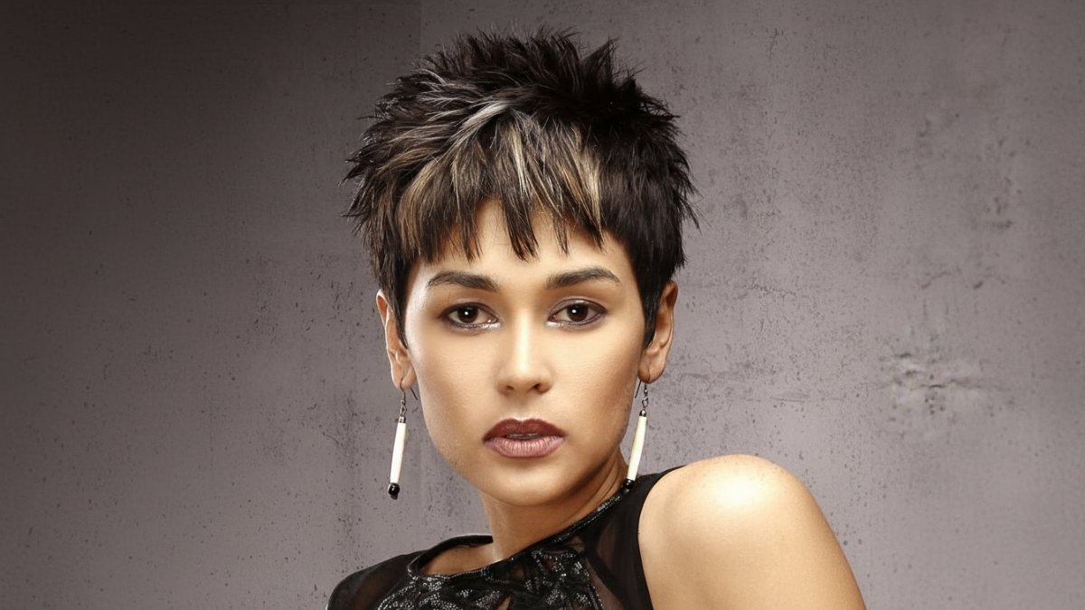 Pair with graphic dresses and sneakers for playful edge, alongside bronzed skin and red lipstick amplifying the modern spiky style. Perfect for creative workplaces and fun nights out, this edgy short hair inspires bold confidence.