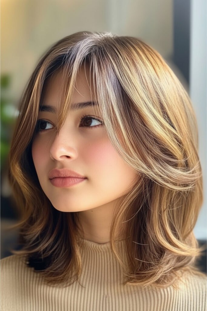 A chin length bob with curtain bangs gives soft framing and graceful flow, creating a gentle winter hairstyle for short hair that feels feminine and cozy. Light texture adds movement, making it perfect with long wool coats, knit scarves, and delicate jewelry.