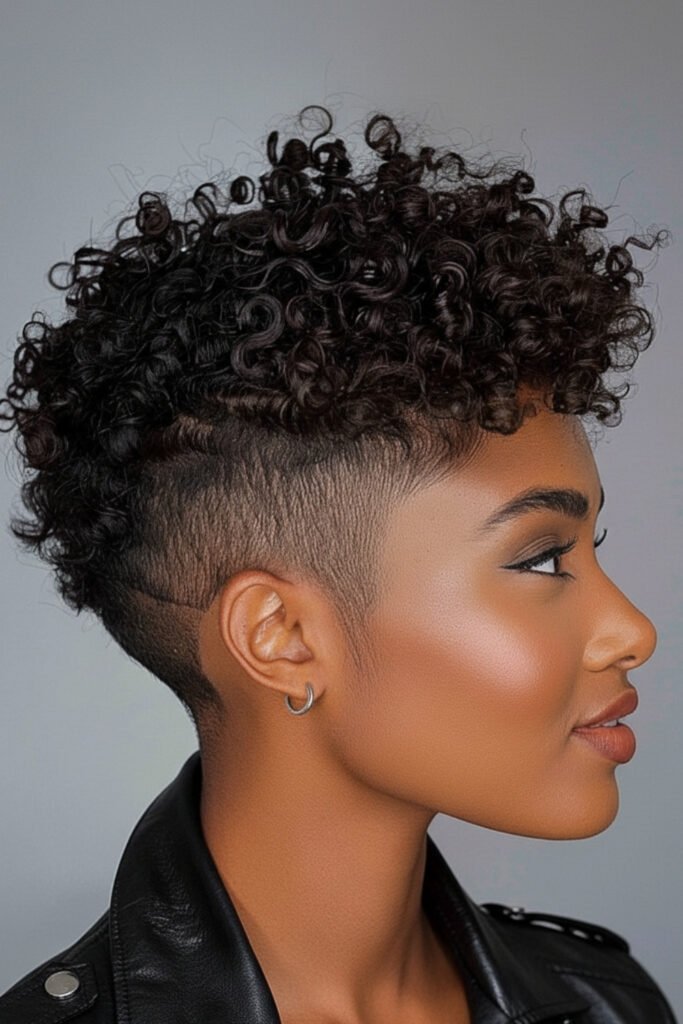 A textured afro pixie shines beautifully in winter with soft coils and moisturized definition. The shape creates volume and a warm cozy hair look that feels natural and elegant. Pair with a wool coat, knit scarf, and hoop earrings.