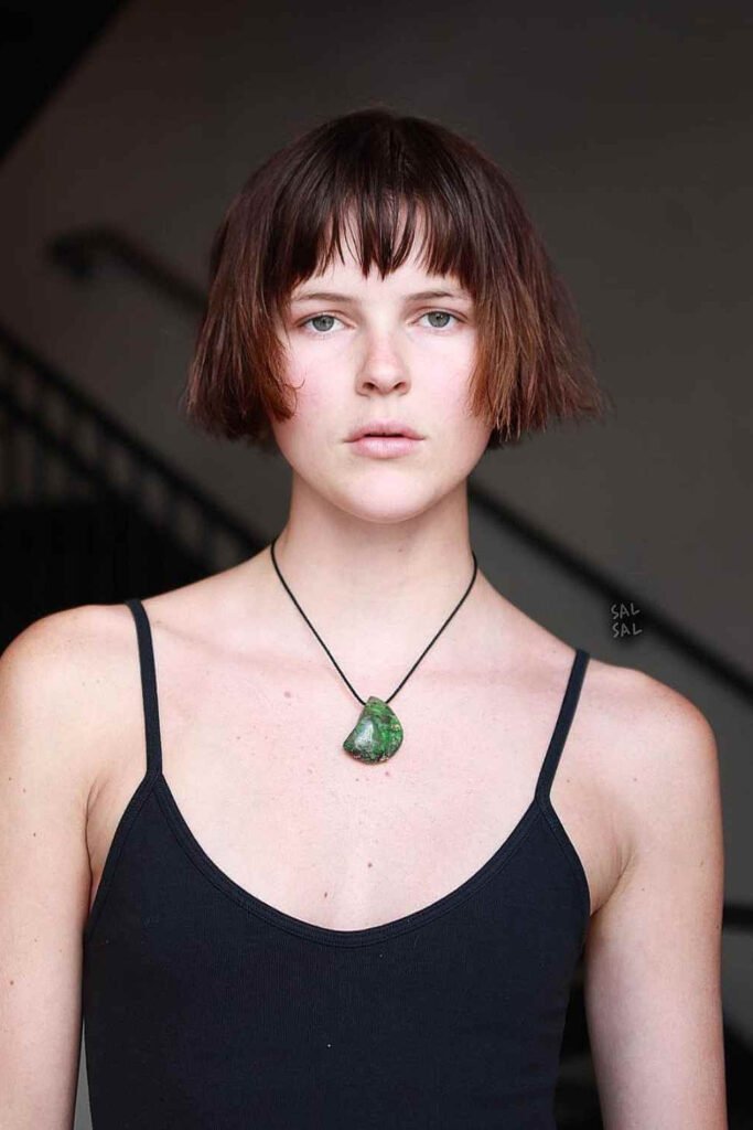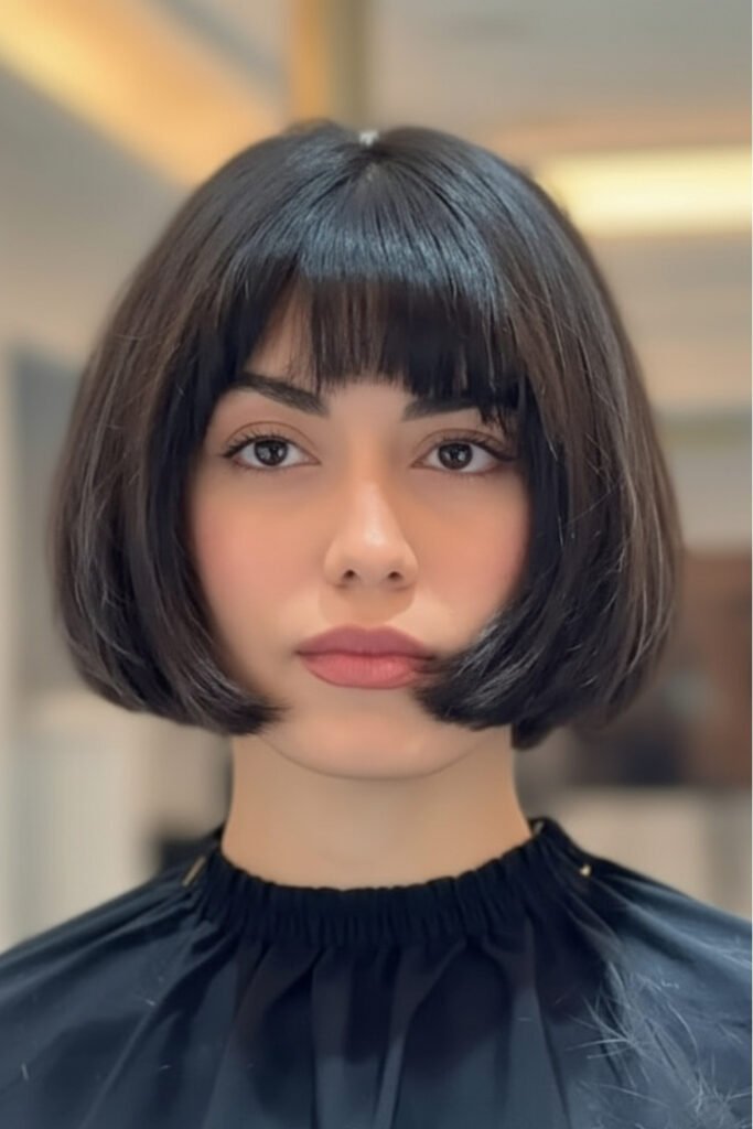 A rounded bob with airy bangs frames the face softly, creating a cozy winter hairstyle for short hair that feels sweet and feminine. The round shape adds fullness and warmth while wispy bangs give delicate movement.