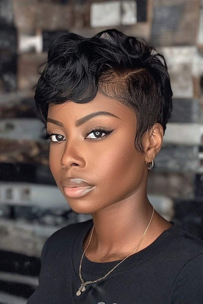 A sleek pixie with tucked sides creates a clean, refined winter look that feels modern and chic. Smooth strands keep the style elegant, making it perfect for stylish women who love timeless cold weather fashion.
