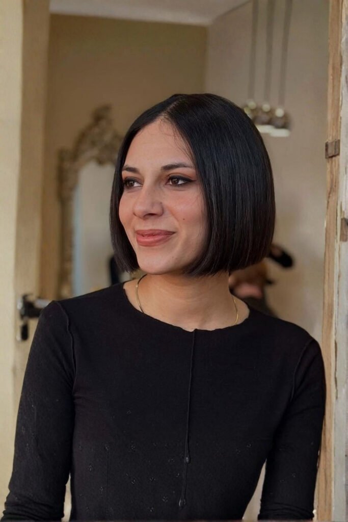 A sleek chin length bob gives a chic short hair look that feels modern, clean, and elegant for winter beauty lovers. Straight strands with a glossy finish add sophistication and make this hairstyle ideal for stylish women who love refined fashion.