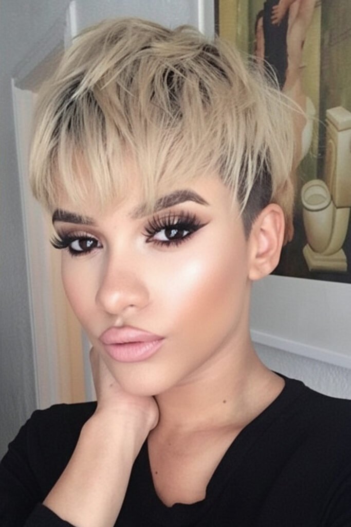 Wear brown eyeliner, peach blush, and creamy nude lipstick. This short hair idea suits winter brunch dates, holiday shopping days, and family gatherings where warm style feels just right.