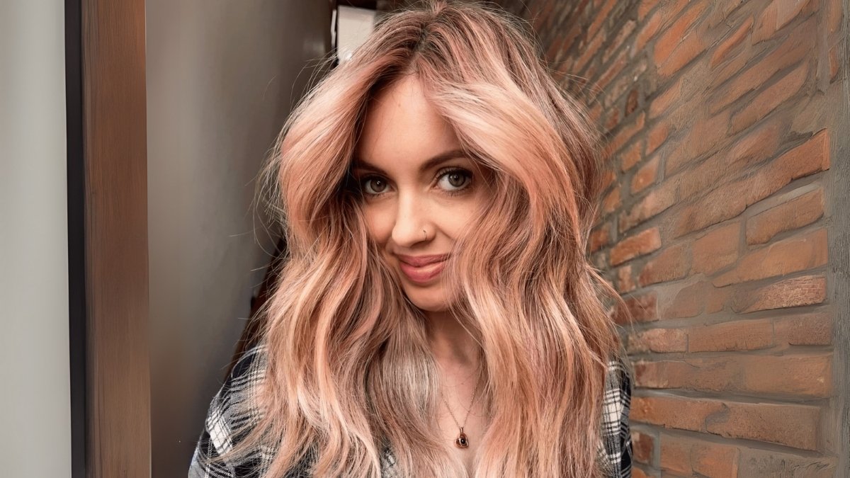 A blend of pastel strawberry blonde hair and rose gold hues creates a soft, modern twist on classic warm blonde hair. The lob (long bob) cut enhances the color’s depth, making it ideal for fashion-forward women.