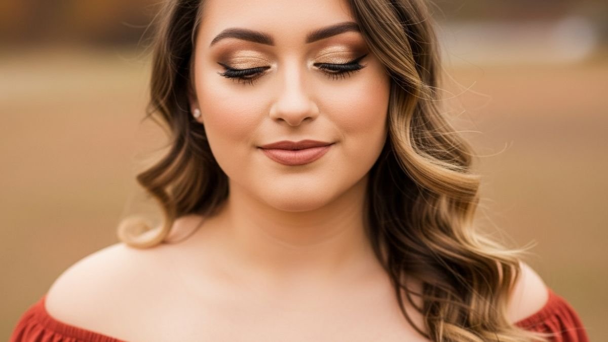 Pair with glossy lips and bold brows for glowing skin. Loose waves make this style soft and feminine. Girls love this style for its seasonal vibe. A gold shimmer fall makeup palette helps you recreate this easily.